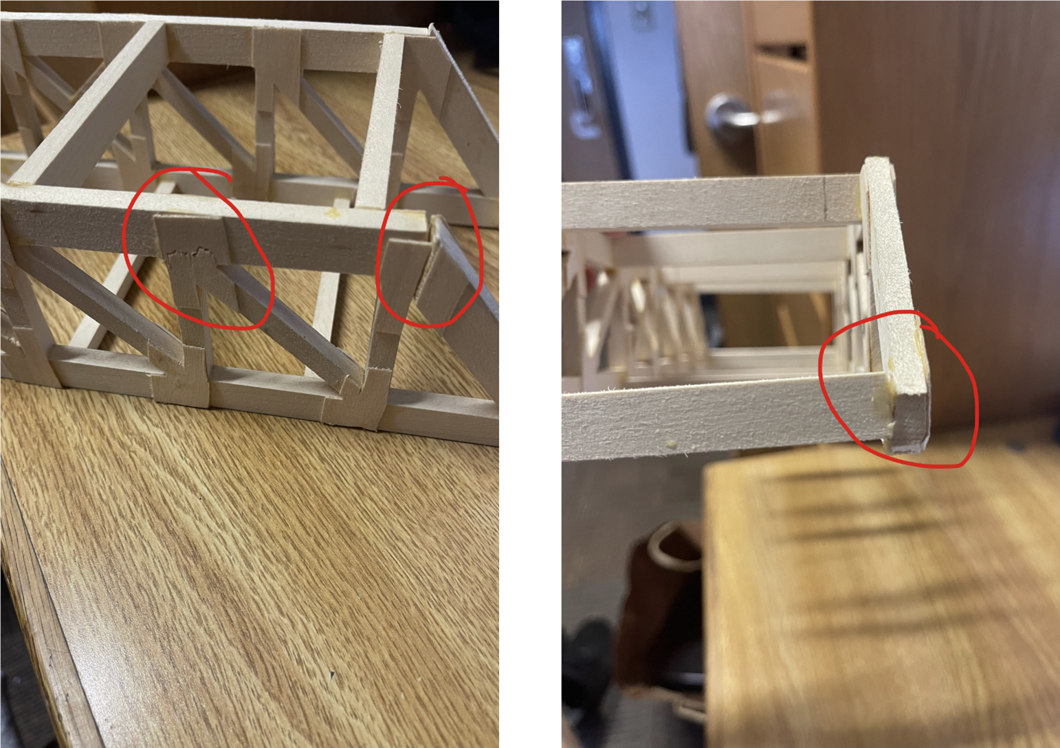 Everyone's bridges were tested on a compression testing machine that had a jig to hold the bridges. The bridge spanned a gap of 35 cm and a downward force was applied in the middle of that gap. I am very pleased with how my bridge performed, it ended up supporting a total weight of 503.5 lbf until some of the joints failed. I also found it surprising that the bridge had such small points of failure, for some reason I would have expected it to be more catastrophic. Since the bridge only weighed 116 g its structural efficiency was 895%. I was also proud of the fact that it outperformed any other bridge tested in my class.