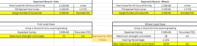 After this, I applied a FOS of 1.5 on the cycle count and determined a material allowable based on the S-N curve for 7075 Aluminum. This allowable would be used for both the hubs and wheel centers. I also determined the material allowable maximum stress for analyzing the maximum loading that each component can handle. Both the fatigue allowable and max stress allowable can be seen below.